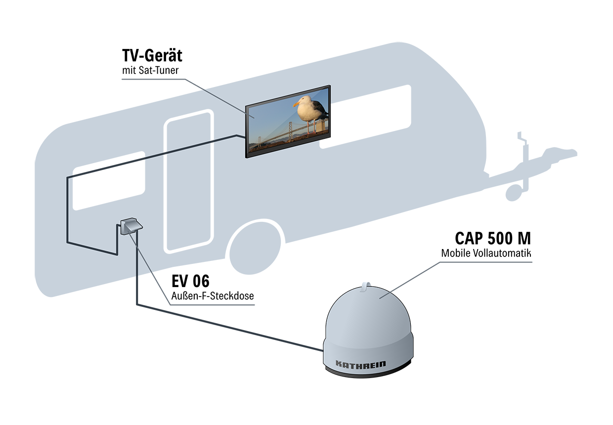 Mit dem Komplettpaket CAP 500M plus wird Camping-Fernsehen einfach, portabel und somit mobil und flexibel. Sehen Sie Ihre Lieblings-TV-Programme auf dem Fernseher oder sogar auf dem Smartphone/Tablet über die kostenlose App CAPcontrol.